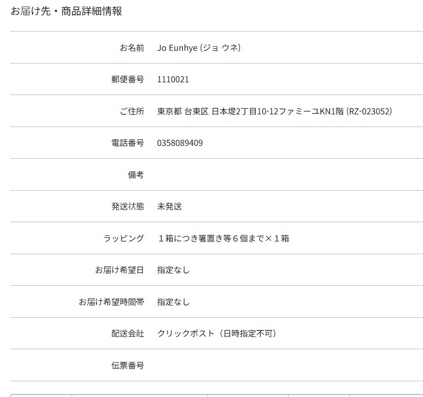 도쿄 영문주소 : JAPAN,TOKYO-TO,TAITO-KU,NIHONZUTSUMI 2-10-12,FAMIYOU KN,1F